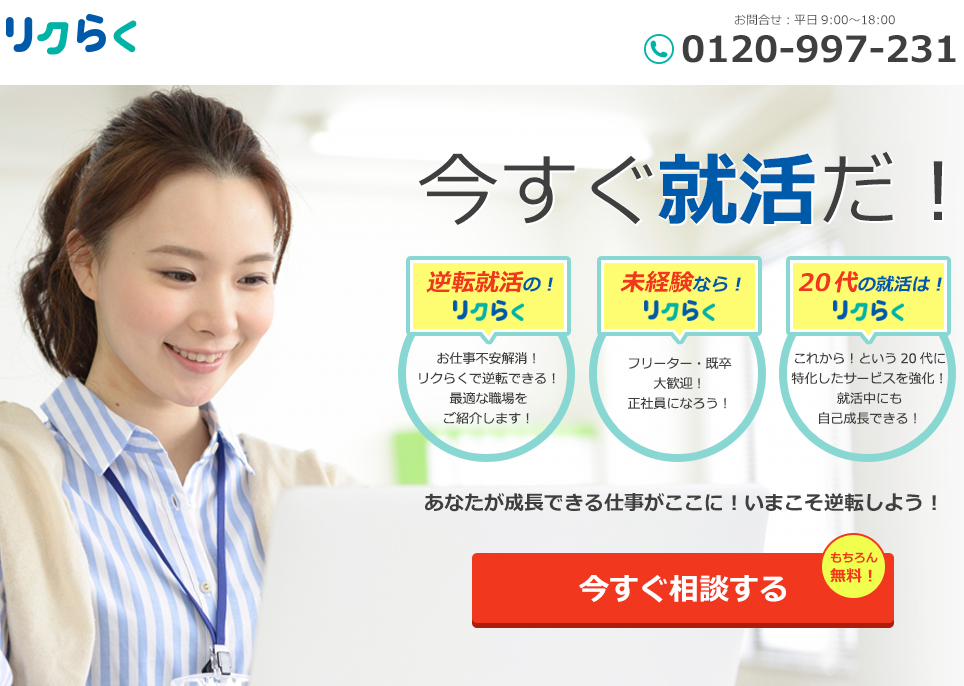 リクらくでは20,000人以上のカウンセリング実績を持つエージェントが実際に訪問した企業しか紹介しないため、普通では出会えない好条件求人が多数!周りがどんどん収入が上がっていって焦っているあなたも、いまなら逆転就活のチャンスです!