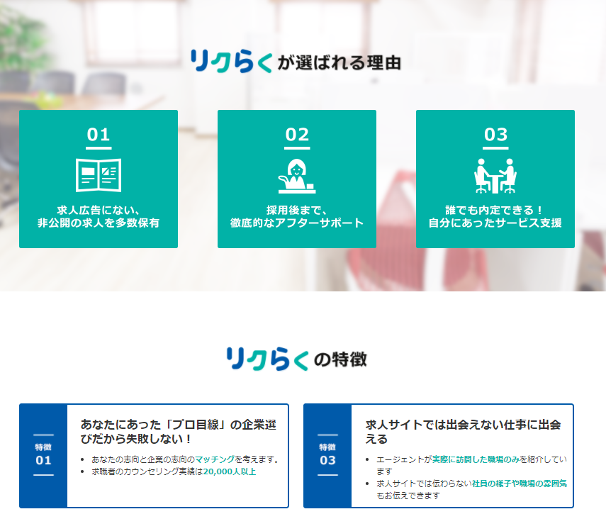 これからの業界の未来やあなた自身の将来設計をするためのヒントを提供してくれます。あなたにあった求人のマッチングから内定後のアフターサービスまで完全無料なのがリクらくの特徴です!