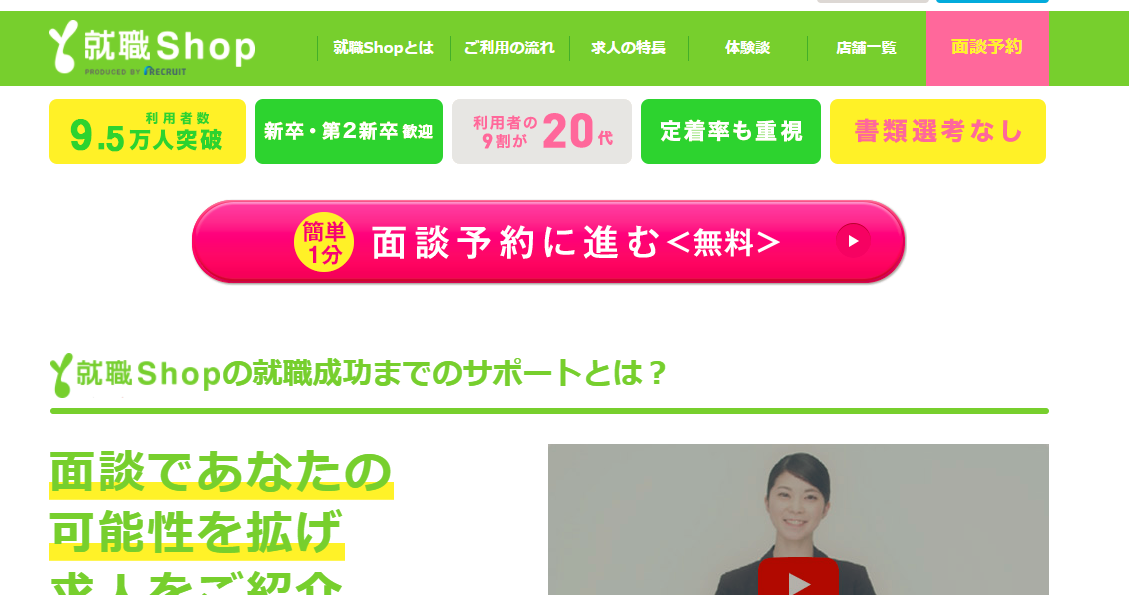 就職Shopはリクルートが運営する、20代に特化した転職エージェントです。特に新卒、第二新卒の未経験求人に強く,20代の方は必ず利用するべきです。
