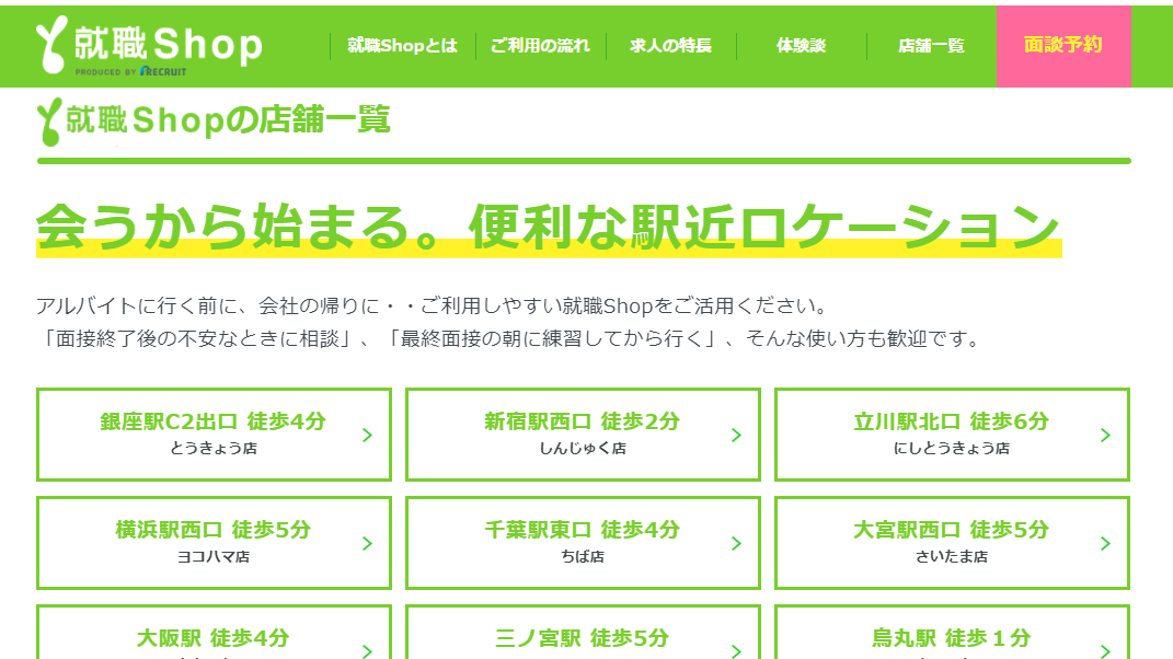 その上で「長く働けること」を重視した厳選された優良企業を紹介してもらえるので安心ですね。就職ショップの就職サポート店舗は全て駅チカにあるので、仕事帰りに気軽によることもできます。