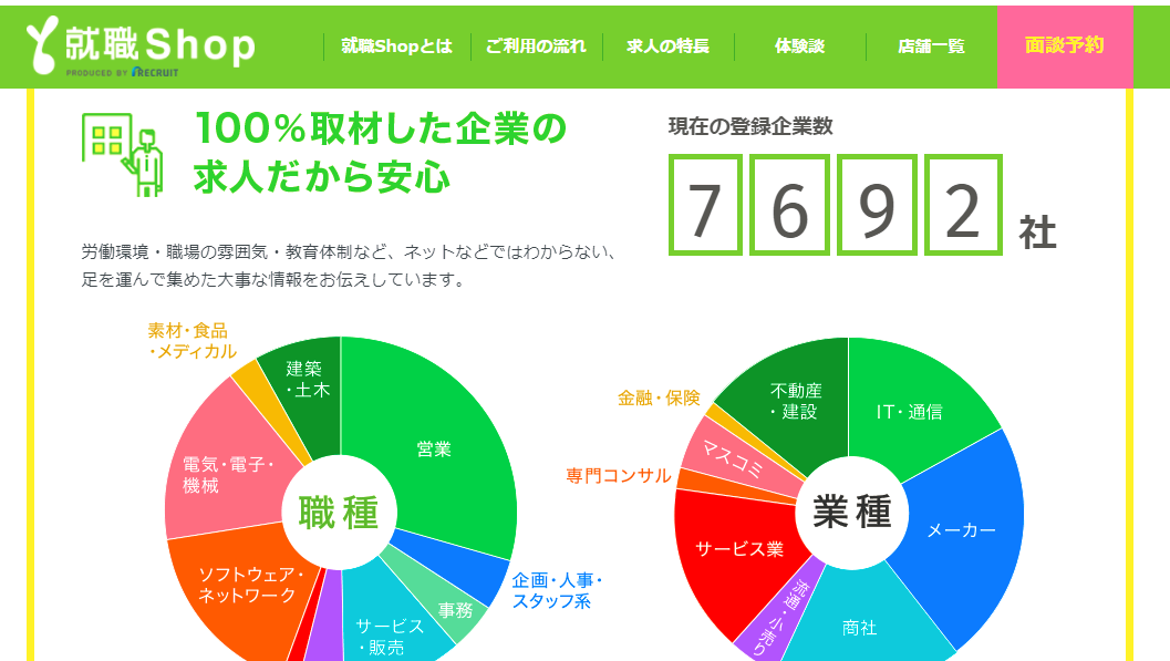 紹介される全ての企業は、就職Shopのスタッフが訪問済です。職場の雰囲気、待遇、経営者の考え方、仕事のやりがいなど、全て丁寧に取材されています。それらがまとめられた求人票と共に求人紹介をしてくれるので、とてもわかりやすいです。