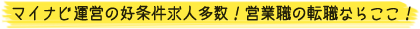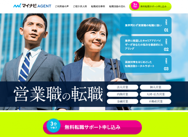 | マイナビジョブ20's | ビズリーチ | マイナビエージェント | 営業の転職マイナビエージェント | 金融の転職マイナビエージェント | Spring転職エージェント | ハタラクティブ | アーシャルデザイン | マイナビエージェントIT | |