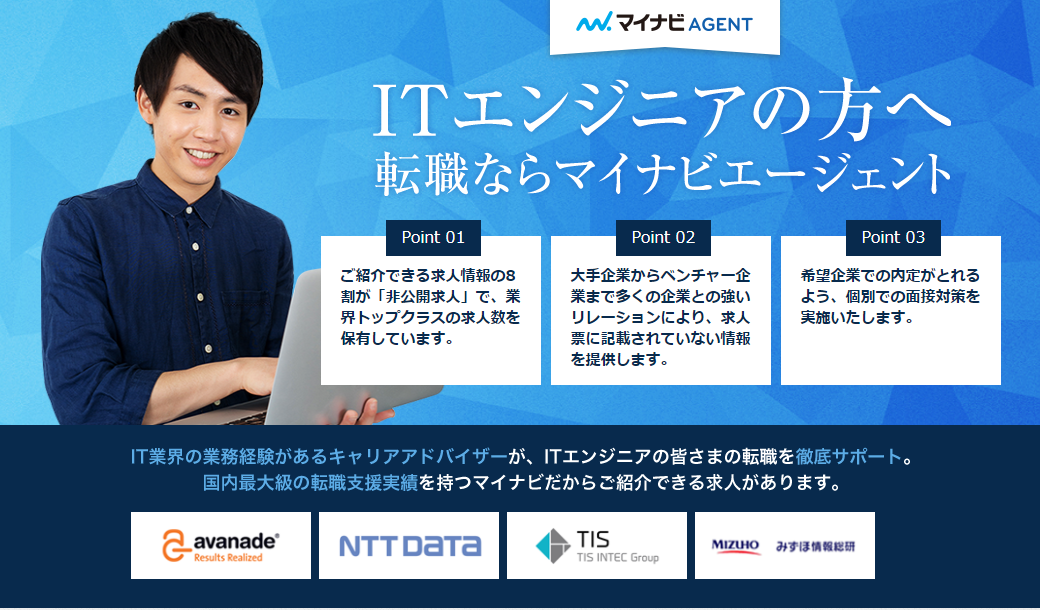 マイナビIT AGENTは転職業界大手のマイナビが運営する転職エージェントです!特に現在はIT人材の求人に注力しており、通常の転職サイトでは出会えない好条件求人が多いのが特徴です!20代~30代の若手人材に特化しているためキャリアアドバイザーの質も高く、5年後10年後を見据えた転職が可能です。現在の職場に不満を感じている方は、まず無料のキャリアカウンセリングを受けてみることをおすすめします!